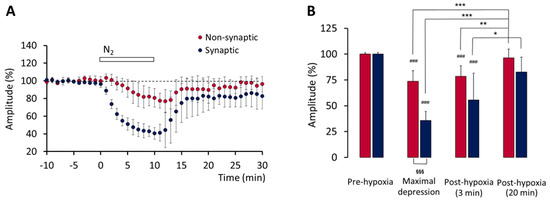Hypoxia-induced changes on fEPSPs recorded in layers II/III of the primary motor cortex, in brain slices from infant rats. (A) Time course of the effect of hypoxia on the amplitude of non-synaptic (red symbols) and synaptic (blue symbols) components of the fEPSPs (n = 5). (B) Amplitude of non-synaptic (red histograms) and synaptic (blue histograms) components of the fEPSPs: comparison of the mean values (± SD) recorded during 10 min before hypoxia onset (pre-hypoxia), during the minute corresponding to the maximal hypoxia-induced depressive effect, and during min 3 and min 20 after re-oxygenation onset. ### p < 0.001, *** p < 0.001, ** p < 0.01, * p < 0.05; §§§ p < 0.001 (vs. the columns indicated).