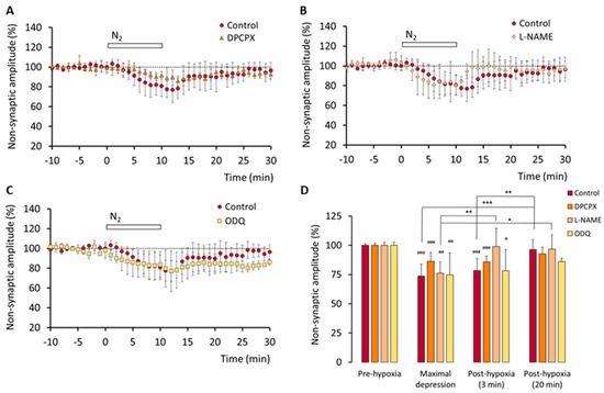 In a series of experiments, the slices (n = 4) were treated with both DPCPX (50 nM) and L-NAME (2 mM). We found that the synaptic fEPSP component was depressed by hypoxia as in DPCPX-treated slices (cf. Figure 3A,C,D): the means of the values were significantly different vs. those recorded in control slices at maximal depression (p < 0.001) and after 3 min of re-oxygenation (p < 0.05).