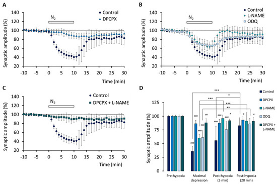 Involvement of adenosine A1 receptors and NO/cGMP in hypoxia-induced depression of the synaptic component of the fEPSPs. Time course of hypoxia effect on the amplitude of the synaptic peak in control conditions (n = 5) and after pre-treatment with: (A) the A1 receptors antagonist DPCPX (50 nM; n = 4); (B) the NO synthase inhibitor L-NAME (2 mM; n = 5) or the NO-sensitive GC inhibitor ODQ (100 µM; n = 5); (C) both DPCPX (50 nM) and L-NAME (2 mM) (n = 4). (D) Comparison of the mean amplitude (± SD) of the synaptic peak recorded during the 10 min before hypoxia onset (pre-hypoxia), during the minute corresponding to the maximal hypoxia-induced depressive effect, and during min 3 and min 20 after re-oxygenation onset in the different conditions indicated. ### p < 0.001, ## p < 0.01; # p < 0.05 (vs. pre-hypoxia). *** p < 0.001, ** p < 0.01, * p < 0.05 (vs. the columns indicated).