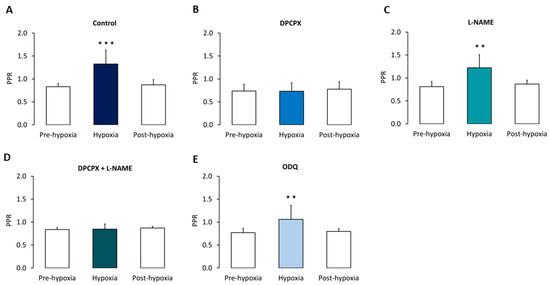 Paired-pulse ratio changes induced by hypoxia. (A–E) Comparison of the mean (± SD) paired-pulse ratio (PPR) of synaptic peak amplitudes (average of six consecutive responses to the second pulse (R2) divided by the average of six consecutive responses to the first one (R1)) recorded during the last minute before hypoxia onset (pre-hypoxia), during the minute corresponding to the maximal hypoxia-induced depressive effect of the response evoked by the first pulse (hypoxia), and during min 20 after re-oxygenation onset (post-hypoxia), in: (A) control conditions (n = 5); (B) after pre-treatment with the A1 receptors antagonist DPCPX (50 nM; n = 4); (C) after pre-treatment with the NO synthase inhibitor L-NAME (2 mM; n = 5); (D) after pre-treatment with both DPCPX (50 nM) and L-NAME (2 mM) (n = 4); (E), after pre-treatment with the NO-sensitive GC inhibitor ODQ (100 µM; n = 5). *** p < 0.005, ** p < 0.01.