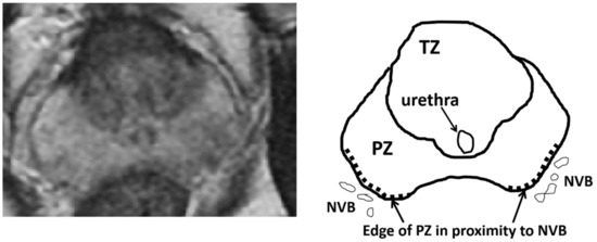 Therapeutic area of the peripheral zone with an adjacent neuro vascular bundle. The figures show axial MRI images of the prostate and the therapeutic areas of the peripheral zone with adjacent neurovascular bundles (dotted line). Abbreviations: MRI, magnetic resonance imaging; TZ, transition zone; PZ, peripheral zone; NVB, neurovascular bundle.