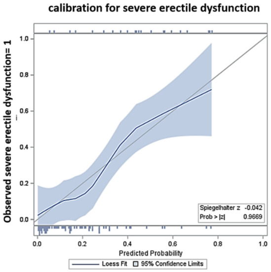 On multivariable logistic regression analysis, lower pre-procedural scores of IIEF-5 (OR 0.812, p = 0.005), lower pre-procedural scores of the sexual domain of EPIC (OR 0.960, p = 0.038), and treatment of the edge of the PZ in proximity to NVB (treated vs. untreated) (OR 8.041, p = 0.028) were significant risk factors for severe ED after treatment (Table 3). The calibration plots did not show a lack of fit of the fitted multivariable model of the pre-procedural score of IIEF-5, the pre-procedural score of the sexual domain of EPIC, and the treatment of the edge of the PZ in proximity to NVB (treated vs. untreated) to the observed deterioration to severe ED (Figure 3).
