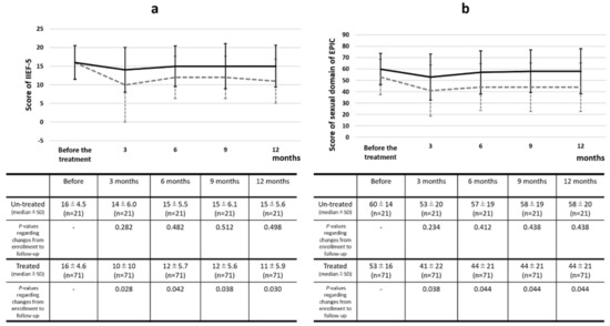 Longitudinal changes in the median score of (a) International Index of Erectile Function-5 and (b) the sexual domain of the Expanded Prostate Cancer Index Composite with standard deviation. Abbreviations: IIEF-5, International Index of Erectile function-5; EPIC, Expanded Prostate Cancer Index Composite; SD, standard deviation.
