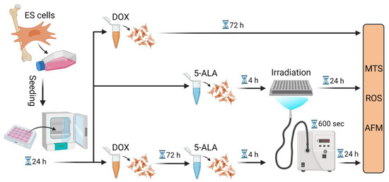 Flow chart of the experimental procedure. Summary of the experimental steps in chronological order, starting from cell seeding to treatment with DOX and/or 5-ALA followed by irradiation. Further measurements were then conducted. Created with BioRender.com. Abbreviations: AFM—atomic force microscope; 5-ALA—5-aminolaevulinic acid; DOX—doxorubicin; ES—Ewing sarcoma; MTS—Cell Proliferation assay; ROS—Cellular Oxidative Stress assay; sec—seconds.
