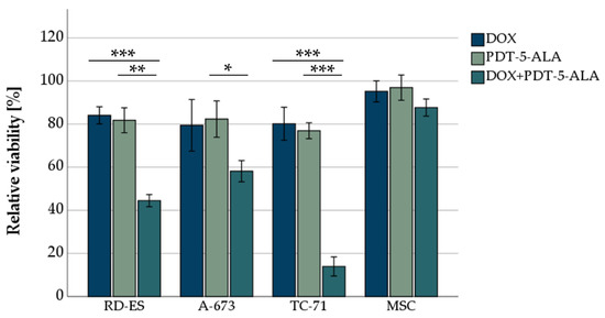 MTS-viability assessment of ES cell lines after DOX treatment and PDT exposure. For DOX, 15 nM was chosen for all three ES cell lines (RD-ES, A-673, TC-71) as well as MSCs. For the photosensitizer 5-ALA, concentrations adapted to the sensitivity of the cell line were chosen (0.15 mM RD-ES, 0.25 mM TC-71, 0.35 mM A-673, and MSCs). Mock-treated control was set to 100% viability. Error bars indicate the standard deviations (* p < 0.05, ** p < 0.01, *** p < 0.001 relative to other treatment). Abbreviations: 5-ALA—5-aminolaevulinic acid; DOX—doxorubicin; ES—Ewing sarcoma; MSC—mesenchymal stem cell; PDT—photodynamic therapy; sec—seconds.