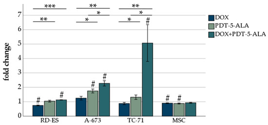 ROS assessment of ES cell lines after DOX treatment and PDT exposure. For DOX, 15 nM was chosen for all three ES cell lines (RD-ES, A-673, TC-71) as well as MSCs. For the photosensitizer 5-ALA, concentrations adapted to the sensitivity of the cell line were chosen (0.15 mM RD-ES, 0.25 mM TC-71, 0.35 mM A-673, and MSCs). Results are presented as mean fold difference of mock-treated control. Error bars indicate the standard deviations (* p < 0.05, ** p < 0.01, *** p < 0.001 relative to other treatment, # p < 0.05 compared to untreated control group). Abbreviations: 5-ALA—5-aminolaevulinic acid; DOX—doxorubicin; ES—Ewing sarcoma; MSC—mesenchymal stem cell; PDT—photodynamic therapy; sec—seconds.