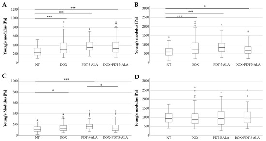 Analysis of Young’s modulus of human ES cell lines and MSC controls. Box plots (medians, minimum, maximum) of the cellular stiffness (Pa) for each cell line is displayed (RD-ES: (A) A-673: (B) TC-71: (C) MSC: (D). Outliners are depicted by circles. Statistical significance is indicated by stars over the compared datasets (* p < 0.05, *** p < 0.001). ES cells treated with DOX, PDT, or in combination were stiffer than their corresponding untreated cells, whereas MSCs serving as controls showed no significant change in elasticity. Abbreviations: 5-ALA—5-aminolaevulinic acid; DOX—doxorubicin; ES—Ewing sarcoma; MSC—mesenchymal stem cell; NT—no treatment control; PDT—photodynamic therapy.