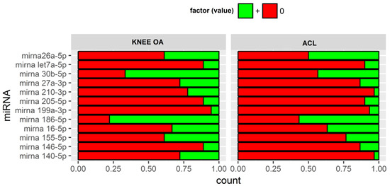 In conclusion, our results show a common expression pattern of the 12 miRNAs analyzed (26a-5p, 27a-3p, let7a-5p, 140-5p, 146-5p, 155-5p, 16-5p, 186-5p, 199a-3p, 210-3p, 205-5p, 30b-5p) between subjects with ACL injury and knee OA. Different bimolecular factors are involved in the development of post-traumatic osteoarthritis and probably some of them are present since the moment of injury. This study highlights some interesting aspects in the expression of miRNAs in ACL injury and in knee OA in relation to different factors, such as sex, gender, and time since the onset of the disease.