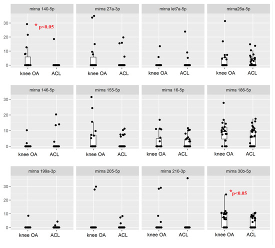 For many miRNAs, the characteristic “boxes” are not visible in the boxplot diagram since the majority of the values are zero and are therefore “squashed” on that particular value. Specifically, miR-let7a-5p was not present in 90% of samples of the ACL group and 89.9% of samples of the OA group. This result is surprising, since miR-let7a-5p has been proposed to regulate skeletal development by orchestrating the proliferation and differentiation of chondrocytes [23].