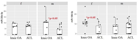 Moreover, a further stratification was performed to compare male vs. male and female vs. female subjects both in Group A and Group B. The results showed that miRNA 186-5p was expressed at higher levels in females with knee OA (p < 0.05) compared to females with ACL tears. This result is not surprising since circulating miRNA 186-5p has been proposed to be associated with knee OA in women. In contrast, miRNA 30b-5p was expressed at higher levels in males with knee OA (p < 0.05) compared to males with ACL tears (Figure 4).