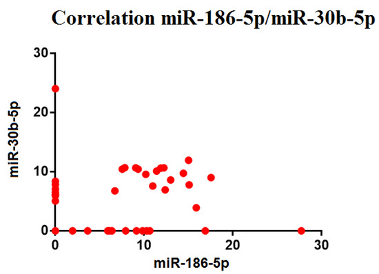 The miRNAs which presented positive Ct values, close to 50%, were further assessed for possible correlations in expression. These correlations, in light of the non-normal distribution of the data, were evaluated through Spearman’s correlation index for ranks. In OA patients, the expression of miRNA 186-5p was positively correlated with miRNA 30b-5p (p < 0.05). No other correlation was found among the expression of the other miRNAs (Figure 6).