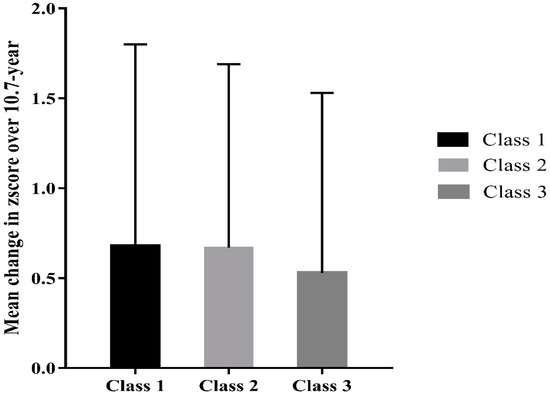 Figure 1 shows changes in falls risk score over 10.7-year. Participants in Class 1 had a larger increase in falls risk score compared with Class 2 and 3 (Figure 1). When comparing the differences in falls risk score over 10.7 years between classes, participants in Class 1 had a higher falls risk score relative to those in Class 2 and 3 (Table 2). Participants in Class 2 had a lower falls risk score than those in Class 3. There was a greater change in falls risk score in Class 1 compared with Class 3. Changes in the falls risk score were not different between Class 1 and 2 and between Class 2 and 3.