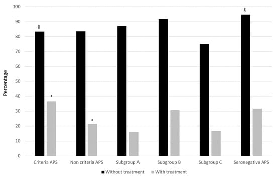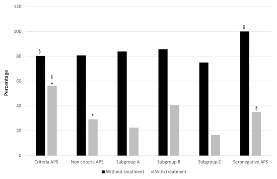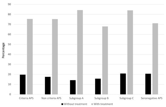 Regardless of the treatment used, the percentage of success with and without treatment in both groups and the live birth rate were very similar between both groups (Table 7 and Figure 3). However, APS patients had a higher rate of fetal losses (p = 0.023) and APO (p < 0.0001) after receiving SoC therapy (Table 7 and Figure 1 and Figure 2), and this was mainly due to a higher rate of abortion < 10 weeks (p = 0.027), fetal death > 10 weeks (p = 0.057), and preterm < 37 weeks (p = 0.008).