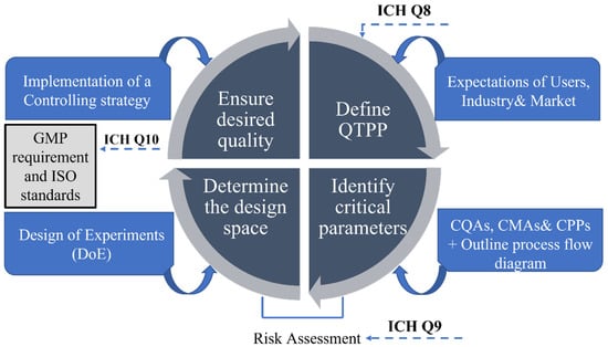 QbD quality management tool showing the principal steps. Abbreviations: ICH: International Council for Harmonization, QTPP: Quality target product profile, CQAs: Critical quality attributes, Critical materials attributes, Critical process parameters, GMP: Good manufacturing process.