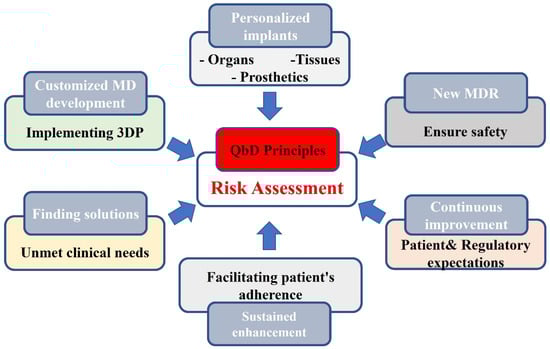 However, MD design poses multiple challenges for design engineering, particularly considering the current change created by the introduction of new medical device regulations (MDR) within the European Union (EU). MD development involves a complex collaboration between regulatory bodies, a highly diverse user base, complex interfacing and vital procedures, and a broad range of interconnected sciences [6]. To address the complexity of the medical and pharmaceutical industry, the US Food and Drug Administration (USFDA) and the EMA continue to work hand in hand to emphasize the importance of adopting a Quality by Design (QbD) quality management framework to facilitate successful production development in a flexible way, integrating the expectations of the patients, as well as the regulatory and biomedical industries [7]. Implementing QbD principles in early phase development would facilitate successful knowledge transfer and ensure a continuous lifecycle product management tool, which would further the acceptability of this profoundly innovative technology of 3DP and ensure its regulatory compliance [8,9]. The introduction of the new MDR prioritizes the safe development of MDs, therefore as adversities will be analyzed, it will support the paradigm shift away from unknown risks towards the future application of 3DP [10].
