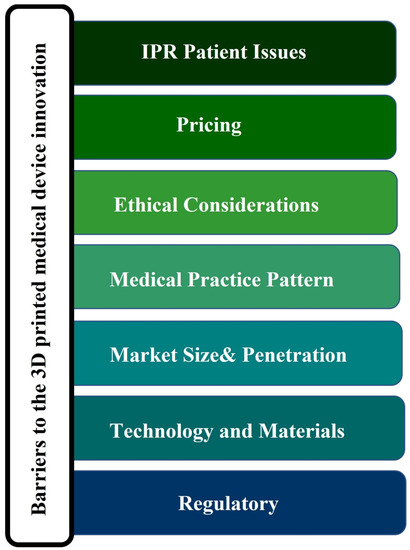 The barriers to the innovation of 3D printed MDs are mainly regulatory issues, intellectual property rights (IPR), patient issues and publication, technology and material failures, ethical considerations, security, medical practice patterns, reimbursement and pricing and subsequently the issue of market size and penetration, meaning the application will most likely be used in developed countries [150], as presented in Figure 4.