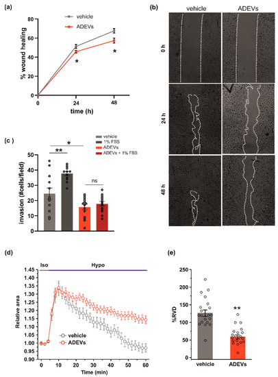 ADEVs limit glioma cell invasion. (a) GL261 glioma cells were treated with a sEV-free fraction medium (vehicle) or ADEVs, and a wound healing (migration) assay was performed. GL261 migration was measured 24 and 48 h after treatment, data are expressed as a mean percentage of wound healing area ± SE, N = 4, Student’s t-test, * p < 0.001. (b) Representative images of wound healing assay on GL261 cells treated as in (a). (c) GL261 cells were assayed for basal or FBS-induced invasion in vehicle- or ADEVs-treated cells on Matrigel. GL261 invasion was measured as a mean of invading cells/field ± SE, N = 3, at least 4 fields/condition; Student’s t-test, * p < 0.05 and ** p < 0.001 (d) Time course of RVD as evaluated from the changes of the relative cell area (Arel) in vehicle-treated cells (Iso, grey bar) and during the application of a 30% hypotonic solution (Hypo, blue bar) to GL261 vehicle-treated cells (vehicle, grey circles, n = 20) and to ADEVs-treated GL261 cells (ADEVs, red circles, n = 19). (e) Bar plot showing the average percentage of RVD in vehicle- and ADEVs-treated GL261 cells, calculated as follows: % RVD = (Arel,peak−Arel,56 min)/(Arel,peak)) × 100. Data are shown as mean ± SEM. Student’s t-test, ** p < 0.001.