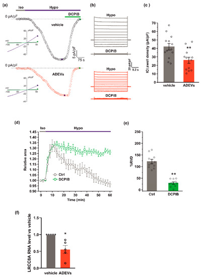 Since hypotonic stress is known to activate ICl,swell [31], we tested if ADEVs, shown to affect ICl,swell-based RVD, do so by modulating ICl,swell. To this end, we performed electrophysiological experiments using a conventional patch-clamp, whole-cell dialyzed configuration, in GL261 cells after 24 h of vehicle or ADEV treatment. ICl,swell density was assessed using current ramps from −100 to +50 mV from a holding potential of −40 mV and activating the current with a 30% extracellular hypotonic solution (Hypo). Upon Hypo application, a significant increase of the inward current was observed at −80 mV in both vehicle- and ADEVs-treated GL261 cells (Figure 3a,b). This hypotonic-activated current was fully blocked by 10 µM DCPIB, a potent and widely used selective blocker of ICl,swell (Figure 3a,b). The quantitative analysis of the DCPIB-sensitive current activated by the hypotonic stimulus showed that vehicle-treated cells exhibited a greater current density (41.9 ± 3.8 pA/pF) than ADEVs-treated cells (26.04 ± 3.6 pA/pF) (Figure 3c), indicating that ADEVs significantly downregulate ICl,swell in GL261 cells. This result was in line with the significant reduction of the RVD observed in ADEVs-treated cells (Figure 2d,e). Of note, the application of 10 µm DCPIB virtually abolished the re-acquisition of the original cell volume in GL261 cells, confirming the essential role of this current in the RVD process (Figure 3d,e).