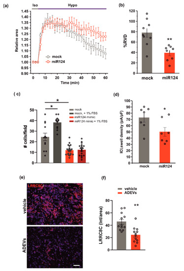 To test whether miR124 would affect VRAC function, and thus the ability to modulate cell volume and invasion, we evaluated RVD, cell invasion and ICl,swell density, in GL261 cells transfected with the miR124 mimic sequence. Similar to what was observed for ADEV treatment, the overexpression of miR124 in GL261 cells: (i) impaired both RVD (Figure 5a,b) and cell invasion (Figure 5c) and (ii) significantly reduced the hypotonic-induced ICl,swell density (Figure 5d). Moreover, we performed immunofluorescence analysis in the tumor mass of ADEVs-treated mice; we observed a significant decrease in the LRRC8C protein expression with respect to vehicle-treated mice. This data confirms that in vivo ADEVs also reduce the VRAC LRRC8C expression. Altogether, these findings support the hypothesis that miR124 is one of the molecules transferred by ADEVs to GL261 cells that mediates vesicles anti-glioma effect downregulating VRAC.