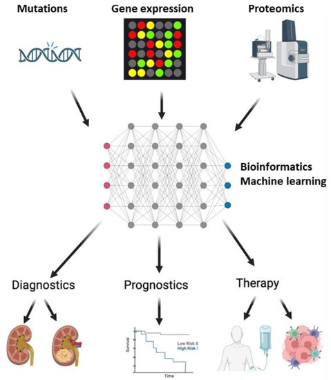 Prognostic signatures using specific biomarkers (genes and proteins, Table 3 and Table 4) can stratify the patients into groups. These groups can then be used for targeting specific genomic aberrations for predicting drug responses [32]. The best example of this approach is the Prosigna breast cancer signature [99] which quantifies gene expression for 50 genes and uses that information to predict the recurrence [100]. Another example is the use of cytogenetics for diagnosis/stratification of leukemia and lymphomas patients with high and low risk and to identify minimal residual disease [101], i.e., the mutation in FLT3 gene causes an aggressive form of acute myeloblastic leukemia which is likely to relapse [102]. Similar methods could also be used in ccRCC using mutational, transcriptomic, and proteomic profiling. With metabolic dysfunction being central to tumor progression and aggressiveness in nearly all cancers, including ccRCC, can provide a potential prognostic tool based on metabolic signatures [35]. TCGA analysis found survival outcomes are associated with alternations of mRNA and miRNA expression of multiple metabolic pathways, including glycolysis, Krebs cycle, pentose phosphate pathway (PPP), fatty acid synthesis, PI3K, and AMPK pathway [26]. Dynamic changes to the tumor microenvironment occur in ccRCC development as well as in response to systemic therapies, and clinical trial data have been evaluated to better stratify patients to specific treatments based on gene expression data [9,36,37,38]. Integration of machine learning can identify complex relationships between the gene-gene and gene-protein interactions in regard to survival, recurrence, and treatment responses. The drawback is that overfitting or underfitting the data can lead to false discovery. To overcome that, larger validation studies are needed in a clinical trial controlling all the variables. The eventual application of such signatures in the clinic can guide the physicians for early diagnosis and prognosis to stratify the patients to be treated aggressively or conservatively.