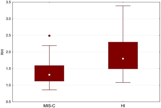 RHI in MIS-C vs. HI. Boxes indicate the interquartile range. White squares within boxes indicate medians. Whiskers extend to the highest or lowest values. HI: healthy individuals; MIS-C: multisystem inflammatory syndrome in children; RHI: reactive hyperemic index.