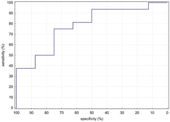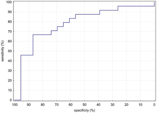 We found a negative moderate, statistically significant correlation of RHI with Cys C (r = –0.540; p = 0.006), as shown in Table 6 and Figure 3. We confirmed the difference in groups with RHI ≤ 1.4 and RHI > 1.4 using the Wilcoxon two-sample test (p = 0.045), as shown in Figure 4, and looked for a clinical cutoff between the groups, with the ROC area under the curve of 77% (Figure 5). We found the statistically strongest cutoff at a Cys C value of 0.89 mg/L, with a specificity of 75%, a sensitivity of 75%, an odds ratio of 9, and 95% CL of 1.62–21.54. Using Fisher’s exact test, we demonstrated a frequency difference between groups with Cys C below and above the value of 0.89 mg/L (p = 0.032). Statistically proven results indicate that in our cohort of children and adolescents (≥9 years), patients with Cys C above 0.89 mg/L have a 9 times higher risk of ED.