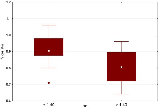 S-cystatin C vs. RHI cutoff for children with MIS-C. Boxes indicate the interquartile range. White squares within boxes indicate medians. Whiskers extend to the highest or lowest values. RHI: reactive hyperemic index.