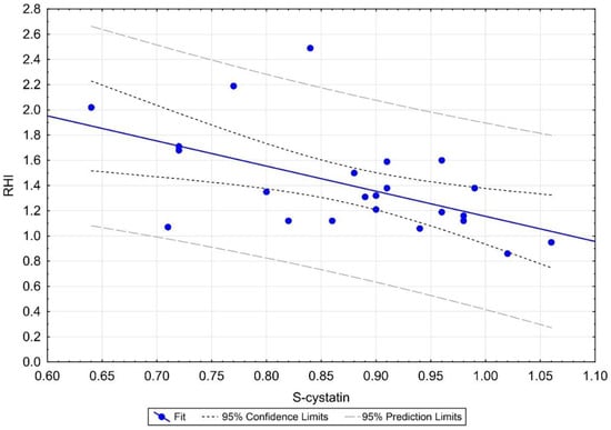 Finally, multivariate data analysis was performed using multivariate and logistic regression (stepwise regression). We confirmed a statistically significant Cys C factor, where higher Cys C values mean lower RHI values (p = 0.041).
