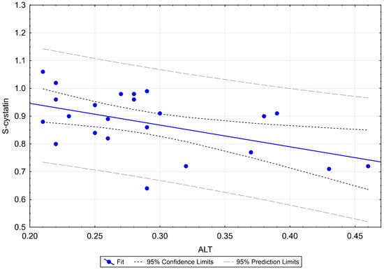 Statistically significant correlations of Cys C with the following parameters were confirmed: a negative moderate correlation with RHI, also mentioned in Section 3.4.2 (r = −0.540; p = 0.006), a positive moderate correlation with antiplatelet agents (r = 0.566; p = 0.004), a negative moderate correlation with ALT (r = −0.513; p = 0.010), as shown in Figure 6: patients with higher ALT tend to have lower Cys C values, a positive weak correlation with SDMA (r = 0.458; p = 0.024): patients with higher SDMA tend to have higher Cys C values, and a positive weak correlation with creatinine (r = 0.411; p = 0.046): patients with higher serum creatinine levels tend to have higher Cys C values.
