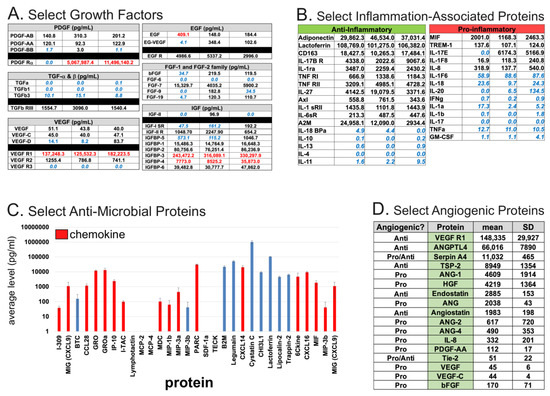 Summaries of select biomolecules of interest identified by multiplexed ELISA [15]. Each classification of the proteins shown was based on Gene Ontology annotations from the above-referenced study. (A). Select growth factors measured by ELISA from three independent donor-derived clinical grade cfAF samples. The growth factor is indicated by top header and left-most column, with the levels (pg/mL) measured indicated for each of three independent donors. Values in blue text indicated those below the level of detection for positive control, and those in red text indicate those above the level of detection for positive control. (B). Select inflammation-associated proteins measured as in part (A), and separated by anti-inflammatory (left) or pro-inflammatory (right) annotation. Values are shown in pg/mL and for each donor-specific batch of clinical grade cfAF as in (A). (C). Select mean values (pg/mL) of anti-microbial proteins shown by bar graph with error bars indicating standard deviation, as calculated in (A,B). Those shown in red are also annotated as chemokines. (D). Select angiogenic proteins shown, with “Angiogenic?” column header indicating whether the specific protein is annotated as pro- or anti-angiogenic, “Protein” column header indicating protein name, “mean” indicating mean value (pg/mL) from the three independent donor-derived lots of clinical grade cfAF as above, and “SD” indicating the standard deviation from the mean value.