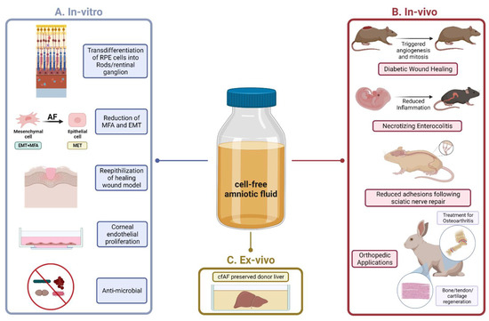 Summary of Translational Studies using Cell-Free Amniotic Fluid. (A). The in vitro studies (left panel) highlight fundamental studies that have added significant depth and understanding to the mechanistic underpinnings of how the therapeutic effects of cfAF are mediated in target cells/tissues. (B). The in vivo studies (right panel) highlight several animal models that have been used in cfAF research. Notable studies include rodent models of (from top to bottom): diabetic chronic wound healing, necrotizing enterocolitis, and nerve regeneration; rabbit models for various orthopedic applications including osteoarthritis and musculoskeletal regeneration are shown at the bottom. (C). The ex-vivo study (bottom, middle panel) references the application of cfAF in liver organ-tissue preservation prior to transplantation. (Image created with Bio Render).