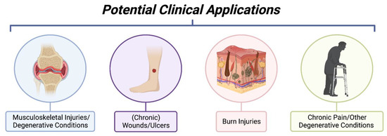 Summary of Potential Clinical Applications of Cell-Free Amniotic Fluid. Investigative clinical studies using cell-free amniotic fluid have been applied to musculoskeletal injuries such as those involving synovial joints, wound healing of chronic pressure ulcers, burn injuries to promote tissue regeneration, and in settings of chronic pain. The mentioned clinical applications are not exhaustive and only represent current applications under investigative study with published results. (Image created with Bio Render).