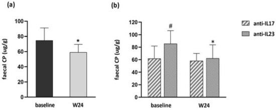 (a) Mean baseline and W24 faecal CP levels. (b) Mean baseline and W24 faecal CP levels stratified by anti-IL17 and anti-IL23 treatments. (a,b) Data are displayed as mean ± SD. Statistical analysis was performed with Wilcoxon matched pairs test: * p < 0.05 with respect to baseline; Mann–Whitney test: # p < 0.05 with respect to subjects on anti-IL17 drugs.