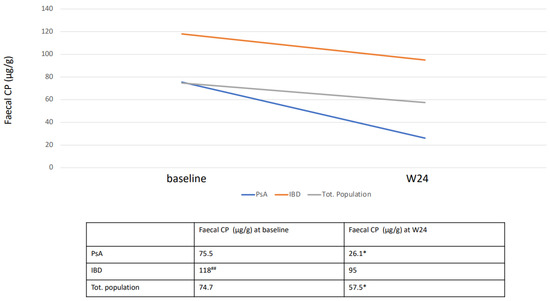According to co-morbidities, baseline faecal CP levels were 118 μg/g in patients affected by IBD and 75.7 μg/g in patients affected by PsA. Faecal CP levels of IBD subjects were significantly higher respect to PsA (p < 0.01). At week 24, faecal CP levels were reduced in both conditions, but significantly only in PsA subjects (p < 0.05) (Figure 2).
