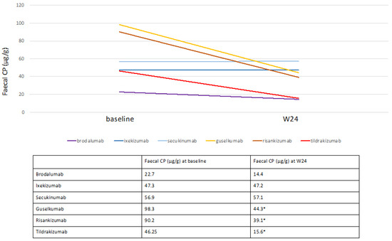 Mean baseline and W24 faecal CP levels stratified by single biological drug. Data are displayed as mean. Statistical analysis was performed with Wilcoxon matched pairs test, * p < 0.05.