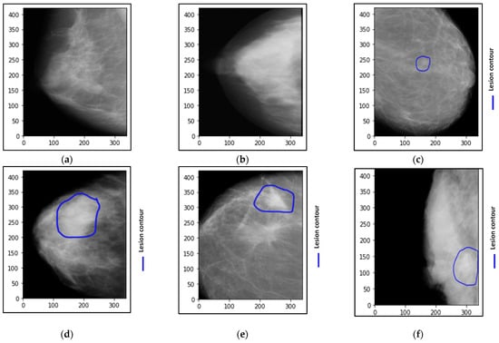 Examples of breast cancer mammograms with the abnormality localization as a blue contour around the breast lesions. (a,b) are normal cases, (c,d) are benign cases, and (e,f) are malignant cases.