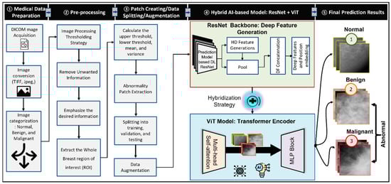 In this study, a new hybrid computer-aided diagnosis is proposed based on the residual convolutional network as well as the transformer encoder (TE) with multilayer perceptron (MLP). The residual convolutional network is used as a backbone network for deep features generation, while the TE is used for the classification purpose based on the Self-attention mechanism. The proposed deep learning model involves a few steps to be fulfilled in order to improve the accuracy of breast cancer detection in mammogram images, as shown in Figure 2. Firstly, the collected medical images were in DICOM format; for simplicity, such images were converted to TIFF by using in-house MATLAB (Mathworks Inc., Boston, MA, USA) code. After that, preprocessing step was applied to remove unwanted artifacts and enhance the boundary of the segmented breast images. Then, labeling, patch images, and augmentation processes were performed. Finally, the proposed AI model was trained and tested using the generated patch images.
