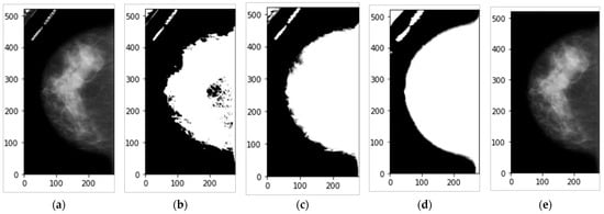 Data preprocessing to extract the whole breast region of interest (ROI) as well as remove the unwanted information using the custom built in image processing technique. (a) The original mammogram, (b) the generated image binary mask using THRESH_OTSU operator, (c) the generated image binary mask using THRESH_BINARY operator, (d) the generated image binary mask using THRESH_TRIANGLE operator, and (e) the corresponding breast image after applying the processing technique.