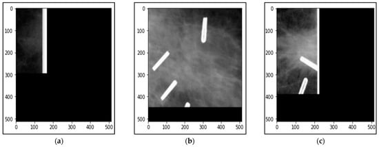 Breast cancer is the second most common disease after lung cancer and affects many women worldwide because it affects the glandular epithelium of the breast [1]. This tumor is created for many reasons; however, there is no guarantee that such reasons confirm the incidence of breast cancer precisely, such as abnormal changes in breast cells or mutation in genes, etc. [2]. In 2020, with an expected 2.3 million new cases, breast cancer in females has exceeded lung cancer as the most often diagnosed malignancy, with 11.7%, followed by lung cancer, with 11.4% [3]. Therefore, many techniques have been recommended by radiologists to detect breast cancer at its curable stage, such as digital mammograms (DM), ultrasound (US), and/or magnetic resonance imaging (MRI). Generally, mammogram imaging is widely utilized for breast cancer detection at its early stage because of its low cost, superior outcomes, and convenience of operation that it provides [1,2]. By using a computer-aided diagnosis (CAD) system and mammogram images, some information regarding breast density, breast shape, and suspected abnormalities such as calcification and masses can be discovered, which helps to detect breast cancer early [1,2,4]. The mammography technique has been reported as the best modality for diagnosing the early stage of breast cancer [5]. It is not a straightforward job to distinguish cancer cell tissues from breast tissues at the early stage of breast cancer, especially for women who have dense breasts [1,2]. For example, Figure 1 shows breast mammograms for six individual cases. Both benign and malignant cases are taken from the Curated Breast Imaging Subset of the Digital Database for Screening Mammography (CBIS-DDSM) dataset, while the normal case was taken from the Database for Screening Mammography (DDSM) dataset.