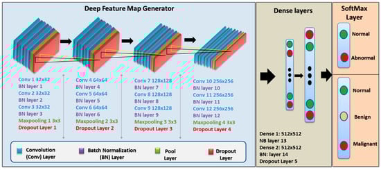 After applying the two procedures, a total of 15,790 patch images were created including 8860 normal patches, and 6930 patches, where 3348 patches were malignant and 3582 patches were benign. This dataset was used to train and test the proposed deep learning CAD system. All normal patches were stored in a folder, and the abnormal patches were also stored in two other folders: one for benign and the second for malignant. All the names of the generated patches files have the ‘PatientID_View_Side_Tile_Tile-Number.tif’ format for normal files, while for abnormal files, the ‘PatientID_View_Side_Cropped_Cropped-Number.tif’ format was used.