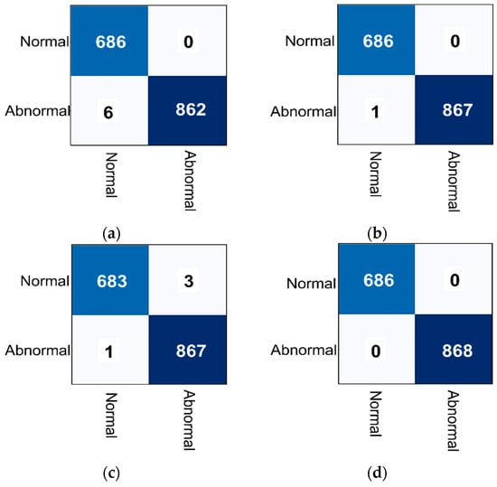 Furthermore, a confusion matrix is used to assess the model classification’s performance, which is an N × N matrix where N represents the number of target classes. The confusion matrix displays both right and wrong values in the graph and reveals not only the number of errors produced by a classifier but also the sorts of errors made. For both normal and abnormal classifications, the ROC was created as a result of the tradeoff between True Positive Rate (TPR) or sensitivity and False Positive Rate (FPR) or specificity. Since the ROC curve depicts the relationship between the sensitivity and 1-specificty for the binary class problem, we used the ready built-in function of “roc_curve” from the Sklearn library, Python [46]. To obtain the ROC and its AUC value for the multi-classification scenario, we performed the strategy of one class vs. others to derive the ROC curves with their AUC values as in our previous work [4]. Then, the averaged AUC values were estimated and reported.