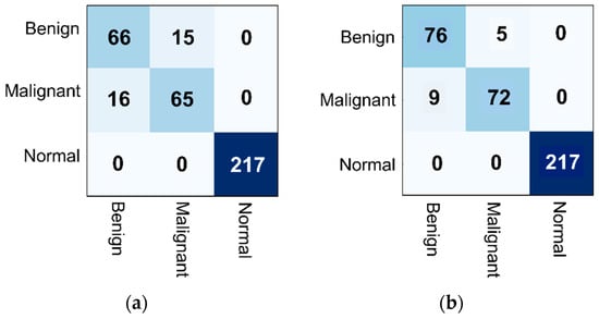 We noticed that 256 × 256 patch images were not enough to distinguish benign from malignant cases since some important features are divided among patches. Therefore, the patch creation was modified to create new patch images (400 × 400 and 512 × 512) without applying augmentation in which larger sizes of benign and malignant features will be taken, the difference here is that the ROI of suspected areas were divided into 400 × 400 or 512 × 512 slices without splitting each one into smaller tiles. Table 5 summarizes the newly created datasets when using 400 × 400 and 512 × 512 patch sizes. The new procedure enhances the overall accuracy, especially with 512 × 512 patches size.