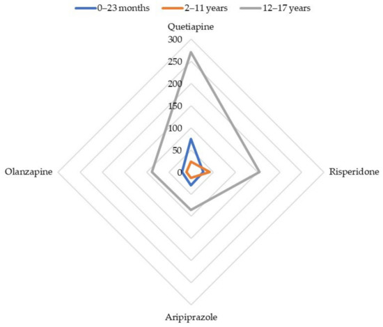 - Sohn, M.; Moga, D.C.; Blumenschein, K.; Talbert, J. National Trends in Off-Label Use of Atypical Antipsychotics in Children and Adolescents in the United States. Medicine 2016, 95, e3784. [Google Scholar] [CrossRef] [PubMed]