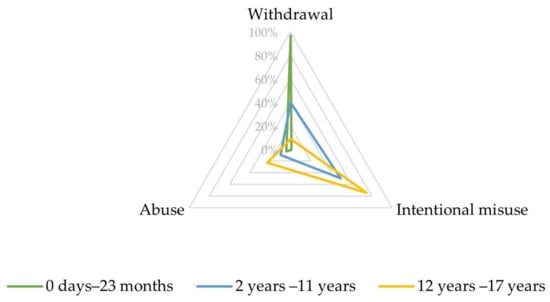 Then, queried reports involving patients aged under 18 were classified into 3 age groups: under 23 months, 2 to 11 years, and 12 to 17 years. For each group, records were aggregated depending on the PTs, into one 1 of 3 categories: misuse, abuse, or withdrawal [18].