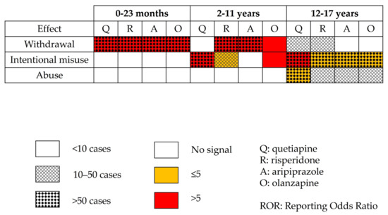 In children aged between 2 and 11 years, the age and gender distribution regarding treatment with antipsychotics in the literature concurs with our findings [43,44,45]. Indeed, significant disproportionality was found for AAP only, subject to a dramatic increase in consumption in children, circumscribed by the rise of off-label use in this population [43,44,46,47]. Regarding risperidone, which is the leading drug in terms of absolute number of reports, both the Food and Drug Administration (FDA) and the European Medicines Agency (EMA) have granted it marketing authorization in irritability occurring in patients with an autistic disorder from the age of 5 [35,48]. Aripiprazole is authorized by the FDA from the age of 6 [34] in the same indication, but its use is only recommended from the age of 13 by the EMA (manic episodes of bipolar I disorder) [49]. Lastly, marketing authorization for olanzapine and for quetiapine is granted by the FDA in acute mixed or manic episodes of bipolar I disorder from the age of 10 [32,33]. However, the EMA stated that their safety and efficacy in children under the age of 18 have not been established yet and, therefore, that they should not be used in this group until further data become available [50,51]. In more than one-quarter of the reports, abuse, dependence, or withdrawal occurred concomitantly with dystonia and/or dyskinesia. These effects may reflect either overdosing following intentional misuse or withdrawal syndrome [52,53], subsequent to dopamine receptor hypersensitivity, GABA insufficiency, or cellular degeneration (neurotoxicity) [54,55]. In cases of withdrawal, the strongest disproportionality signals concerned risperidone and aripiprazole. This may indicate abrupt treatment discontinuations that could be favored by the urge of appeasing irritability and/or aggressive symptoms via the initiation of a new medication (e.g., in patients suffering from autistic disorders). In addition, possible impulsive and voluntary intoxications may also occur, especially in children presenting with behavioral disorders.