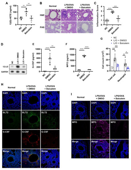 12-LO is also necessary for the production of G-CSF and contributes to neutrophilic airway inflammation. The 12-LO inhibitor baicalein (20 mg/kg) or DMSO was administered by i.p. injection 1 h before each challenge. The negative controls (NC) were untreated. (A) 12(S)-HETE levels in BALF were analyzed by ELISA. (B,C) H&E and PAS staining of mice lung tissues. Perivascular and peribronchial inflammation in addition to mucus secretion, was examined and scored (400×). Inflammation scores are shown as the mean ± SD (n = 5 per group). (D) Mouse lung tissue was homogenized, and the protein was isolated to assess the level of 12-LO by Western blotting. (E,F) G-CSF and MPO levels in BALF were analyzed by ELISA. (G) The number of immune cells in BALF was estimated using a CytoSpin and staining with Diff-Quik. The results are shown as the mean ± SD (n = 5 per group). (H,I) IF staining of mice lung tissue for BLT2 (green, Alexa Flour 488), G-CSF (red, Alexa Flour 647), and MPO (magenta, Alexa Flour 594). Nuclei were counterstained with DAPI (blue; 400×). The IF images are representatives of three independent trials with similar results. All experiments were performed in triplicate. * p < 0.05, ** p < 0.01, *** p < 0.001, **** p < 0.0001 versus each control group.