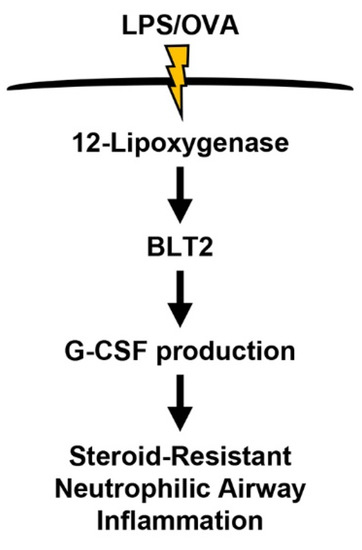 In summary, we have shown that BLT2 played a critical mediating role in the production of G-CSF in steroid-resistant neutrophilic lung airway inflammation. We also found that the blockade of BLT2 suppressed the production of G-CSF, thus alleviating neutrophilic inflammation in the murine model. In support of the mediatory role of BLT2 in the production of G-CSF, the synthesis of its ligands by 12-LO was also shown to be necessary for mediating the production of G-CSF. Together, our results suggest that the 12-LO-BLT2 cascade is critical for the production of G-CSF, thus contributing to the progression of neutrophilic airway inflammation (as summarized in Figure 6). This study was the first to report the mediatory role of BLT2 in the production of G-CSF in neutrophilic asthma. The results provide a new perspective for developing effective therapies for severe neutrophilic asthma.