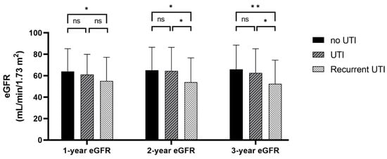 Estimated glomerular filtration rate at 1, 2, and 3 years after kidney transplantation according to the previous episode of UTI or recurrent UTI. * p-value < 0.05, ** p-value < 0.001, ns; p-value > 0.05.