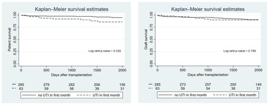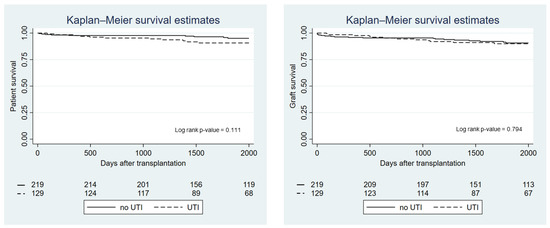 Kaplan—Meier graph showing patient and graft survival according to whether patients experienced a UTI within the first month after transplantation.