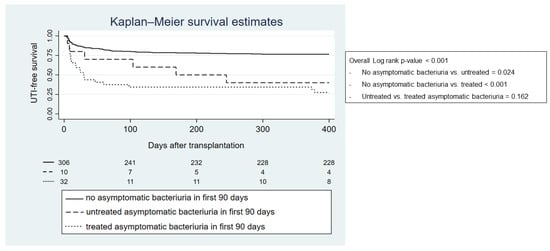 For kidney transplant recipients in the UTI group, the information of immunosuppression at the time of diagnosis was evaluated for the risk of having multi-drug resistant (MDR) organisms defined using non-susceptible to ≥3 antimicrobial categories and recurrent UTI defined as the occurrence of ≥3 UTI in 12 months or ≥2 UTI in 6 months [7,26,27]. ASB is defined via the positive bacterial culture from urine screening protocol in the absence of signs and symptoms of inflammation. The progression from ASB to UTI was analyzed in our cohort via survival analysis (as described in the statistical analysis).